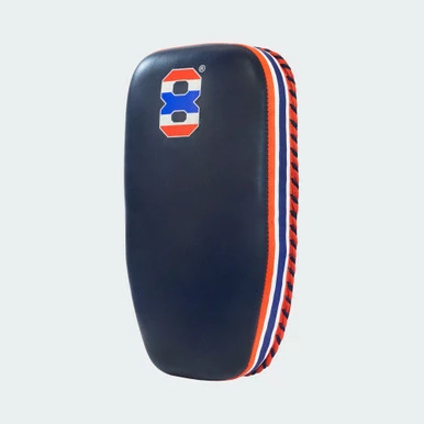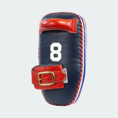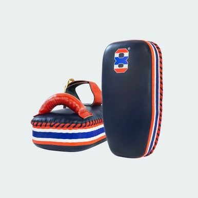 8 Muay Thai Single strap pads are a compact traditional version of the tested and true pads used by the most hardcore gyms in Bangkok Thailand.  Hand made in Bangkok and built to last ultra thick cowhide and nylon sides with multi layered shock absorbing padding.